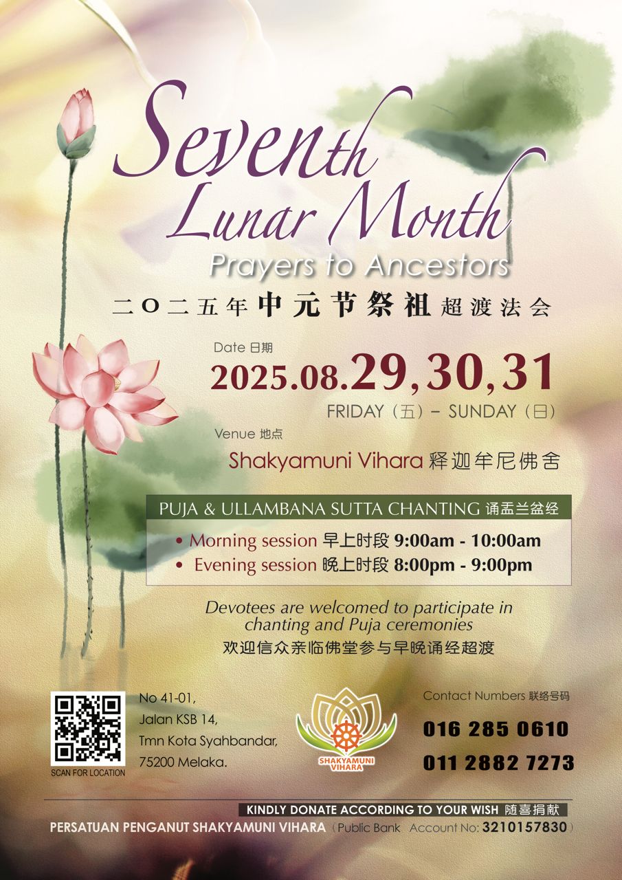 Shakyamuni Vihara warmly invites all devotees and friends to participate in our 7th Lunar Month Prayers, a meaningful three-day ceremony dedicated to honouring and transferring merits to our departed relatives and ancestors.